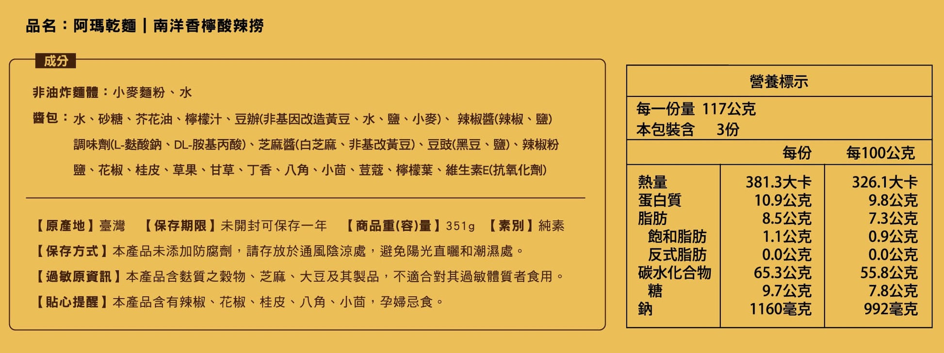 【Sauce Packet】Water, Sugar, Canola Oil, Lemon Juice, Fermented Soybean Paste (Non-GMO Soybeans, Water, Salt, Wheat), Chili Sauce (Chili, Salt), Flavor Enhancers (Monosodium Glutamate, DL-Alanine), Sesame Paste (White Sesame, Non-GMO Soybean), Fermented Black Beans (Black Soybeans, Salt), Chili Powder, Salt, Sichuan Pepper, Cinnamon, Tsaoko, Licorice, Clove, Star Anise, Cumin, Cardamom, Kaffir Lime Leaf, Vitamin E (Antioxidant)