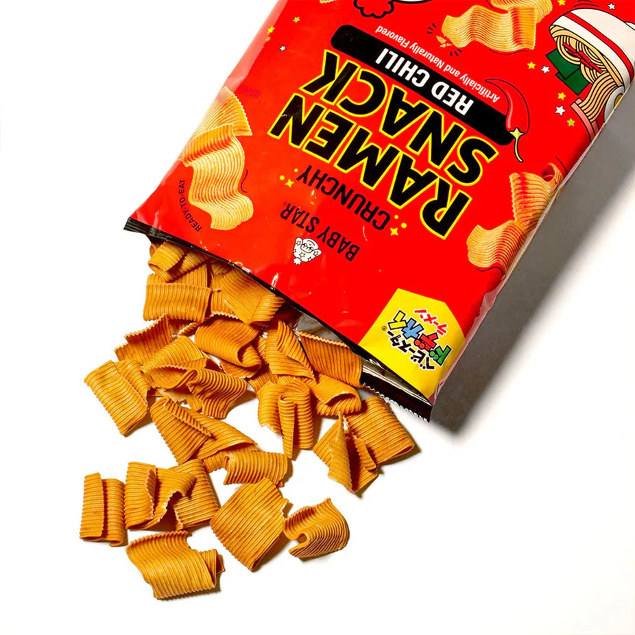 Crunchy ramen snack with extra-wide noodles and a spicy red chili kick! A bold twist on the Japanese classic.