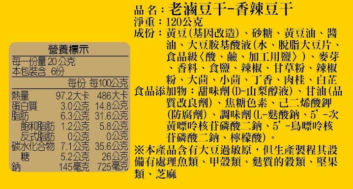 Soybeans (genetically modified), Sugar, Soybean Oil, Soy Sauce, Soy Protein Amino Acid Solution (Water, Defatted Soy Flakes, Food-Grade Acids, Alkalis, and Processing Salt), Malt, Natural Flavors, Salt, Chili, Licorice Powder, Chili Powder, Star Anise, Fennel, Clove, Cinnamon, Angelica Root.