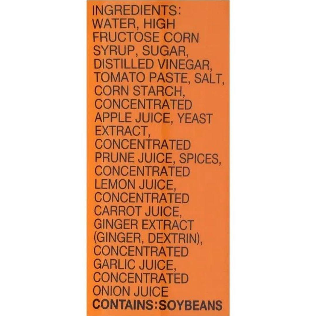 Water, High Fructose Corn Syrup, Sugar, Distilled Vinegar, Tomato Paste, Salt, Corn Starch, Concentrated Apple Juice, Yeast Extract, Concentrated Prune Juice, Spices, Concentrated Lemon Juice, Concentrated Carrot Juice, Ginger Extract (Ginger, Dextrin), Concentrated Garlic Juice, Concentrated Onion Juice.