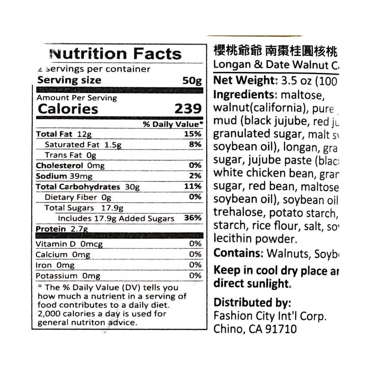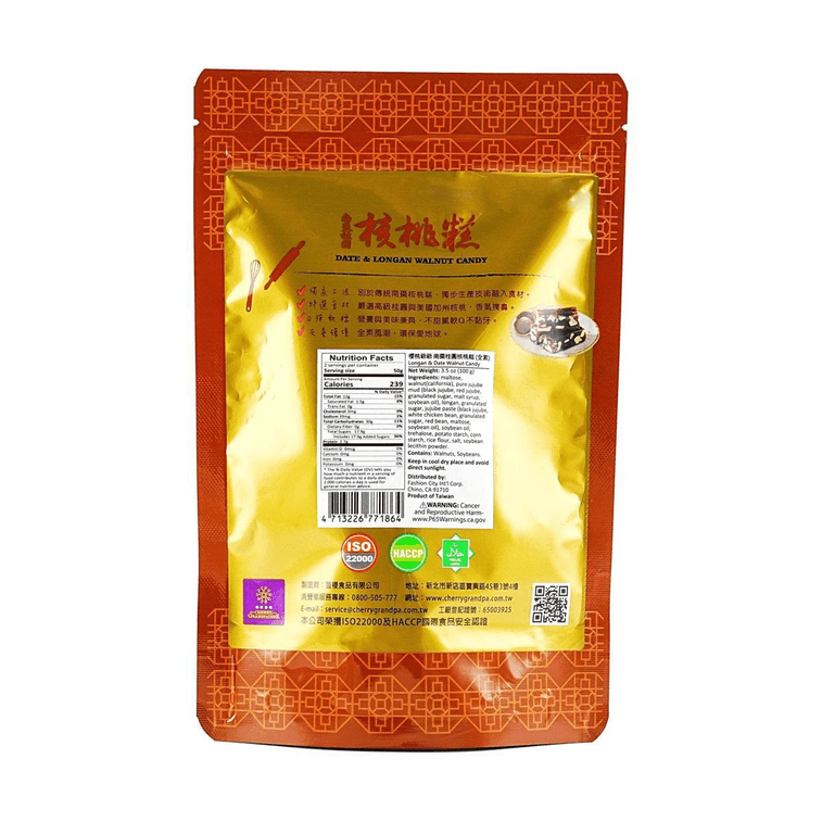 Maltose, California Walnuts, Pure Jujube Paste (Black Jujube, Red Jujube, Sugar, Maltose Syrup, Soybean Oil), Longan, Sugar, Jujube Bean Paste (Black Jujube, White Kidney Beans, Sugar, Red Beans, Maltose, Soybean Oil), Soybean Oil, Trehalose, Potato Starch, Corn Starch, Indica Rice Flour, Salt, Soy Lecithin Powder.