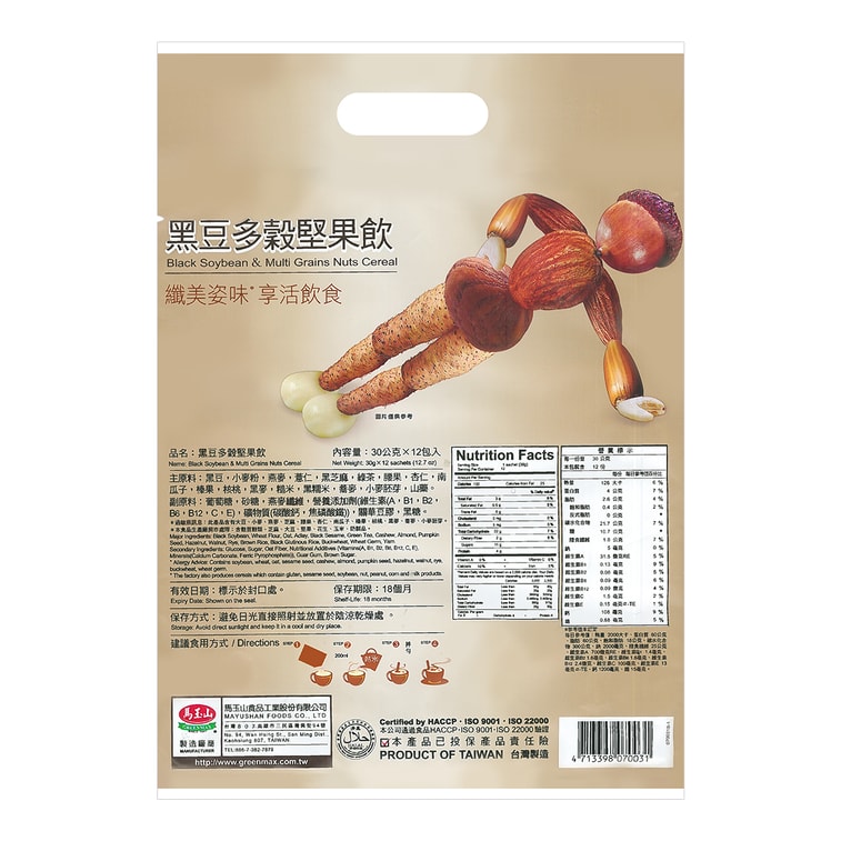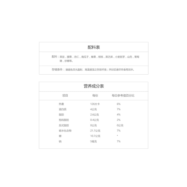 Black Soybean, Wheat Flour, Sugar, Glucose, Oat, Adlay, Black Sesame, Green Tea, Oat Fiber, Nutritional Additives(Calcium Carbonate, Vit. C, Ferric Pyrophosphate, Maltodextrin, Vit.E, B6, B1, A, B2, B12), Cashew, Apricot Kernel, Guar Gum, Rye, Pumpkin Seed, Brown Rice, Black Glutinous Rice, Hazelnut, Buckwheat, Brown Sugar, Walnut, Wheat Germ, Yam.