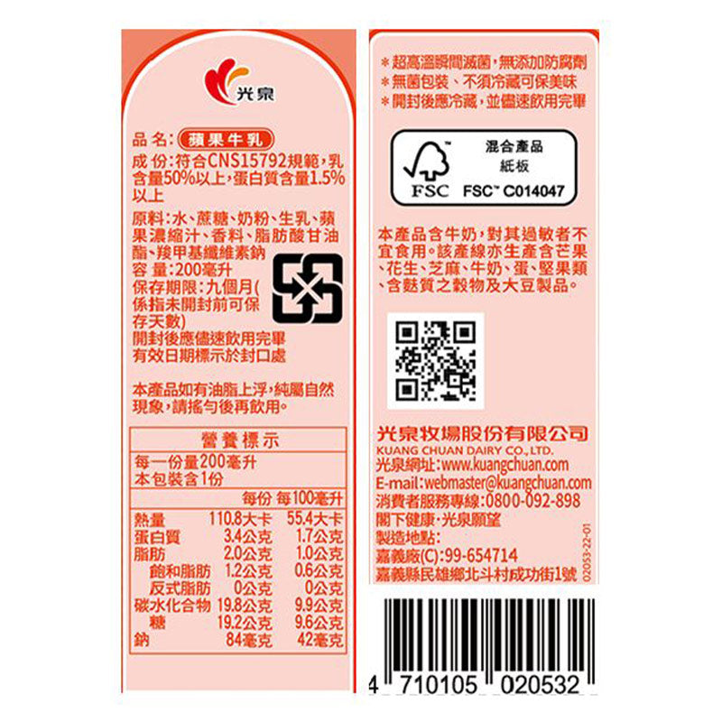 Kuang Chuan Apple Milk (200ml x 6) blends the refreshing taste of apples with the creamy richness of milk, creating a unique and delightful beverage. Made with high-quality ingredients, including fresh milk and apple flavor, it offers a smooth, slightly sweet drink that’s both refreshing and nourishing. The milk is processed using ultra-high temperature (UHT) sterilization and aseptic packaging, ensuring it is free from preservatives while maintaining freshness. This convenient 6-pack is perfect for families or anyone seeking a wholesome, fruity twist on classic milk. Ideal for drinking on its own or enjoying with meals.