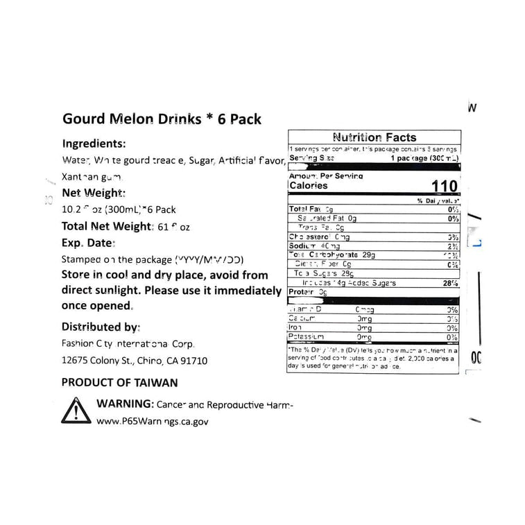 Water, winter melon syrup (cane sugar, winter melon, water), cane sugar, flavoring (contains caramel), corn syrup solids.