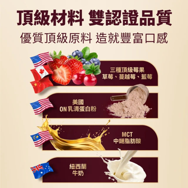Whey Protein Isolate, Wheat Flour, Palm Kernel Oil, Soft Chocolate with Whey [Whey Protein Isolate, Soybean Oil, Sugar, Fully Hydrogenated Palm Kernel Oil, Cocoa Butter, Soy Lecithin, Emulsifiers (Glycerol Fatty Acid Ester, Sucrose Fatty Acid Ester), Vanillin], Strawberry Chocolate [Palm Oil, Lactose, Sugar, Skim Milk Powder, Cocoa Butter, Soybean Oil, Strawberry Bits, Flavoring, Soy Lecithin, Gardenia Red Pigment, Emulsifier (Glycerol Fatty Acid Ester)], Medium-Chain Triglyceride Oil (MCT), Sugar, Milk Powder, Dried Cranberries, Cranberry Juice Powder (Cranberry Concentrate, Maltodextrin, Beet Juice, Flavoring, Sodium Citrate, Annatto Color), Blueberry Powder, Cranberry Flavoring, Salt, Acidity Regulator (Citric Acid), Soy Lecithin, Sweetener (Steviol Glycosides), Leavening Agents (Sodium Bicarbonate, Ammonium Bicarbonate).