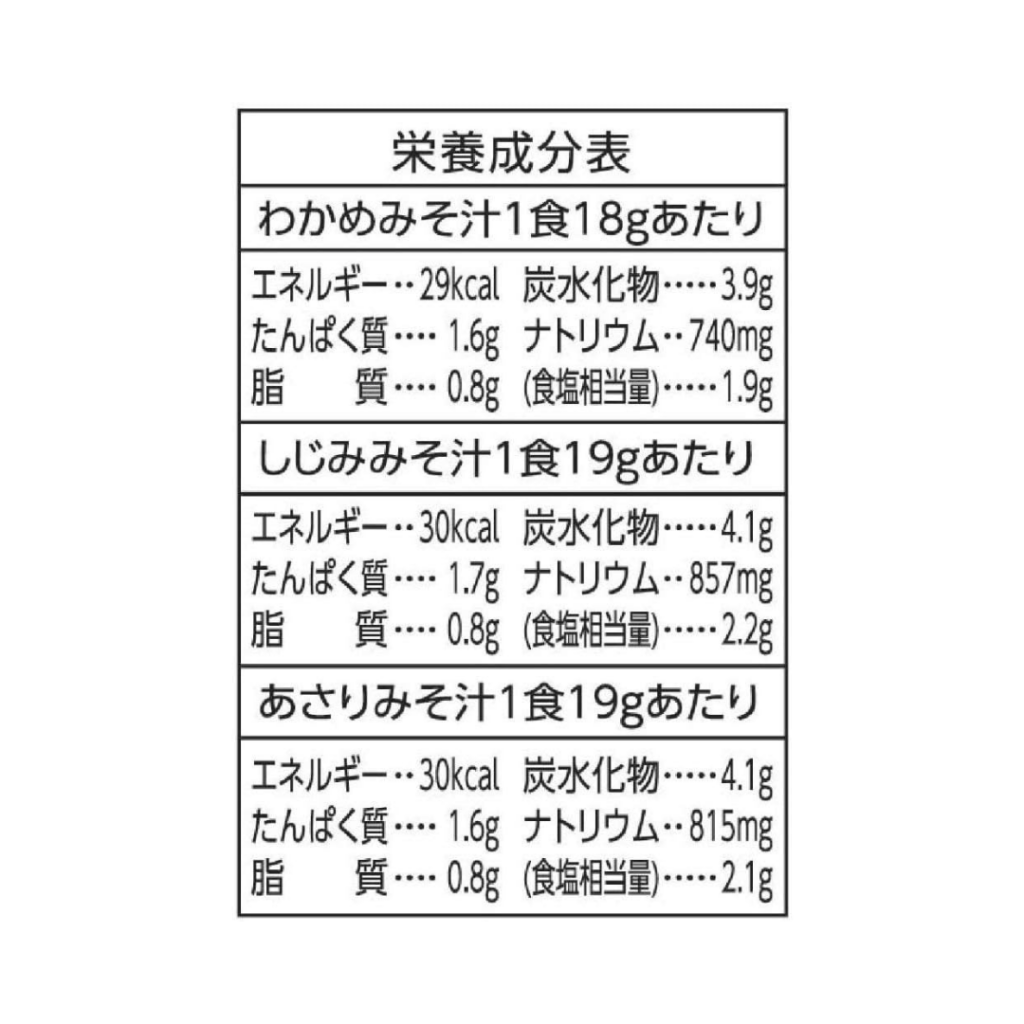 This assortment contains 11 servings of wakame miso soup, 8 servings of shijimi miso soup, and 2 servings of clam miso soup. You can easily enjoy three types of authentic miso soup.