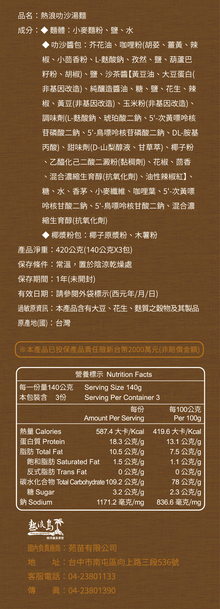 Sauce Packet: Canola Oil, Curry Powder (Coriander, Turmeric, Chili, Cumin Powder, Monosodium Glutamate, Cumin, Salt, Fenugreek Powder, Pepper), Salt, Satay Sauce [Soybean Oil, Soy Protein (Non-GMO), Naturally Brewed Soy Sauce, Sugar, Salt, Peanut, Chili, Soybean (Non-GMO), Corn Flour (Non-GMO), Flavor Enhancers (Monosodium Glutamate, Disodium Succinate, Disodium Inosinate, Disodium Guanylate, DL-Alanine), Sweeteners (Sorbitol Solution, Licorice Extract)], Coconut Powder, Acetylated Distarch Adipate (Thickener), Sichuan Pepper, Fennel, Mixed Tocopherol Concentrate (Antioxidant), Oleoresin Paprika (Colorant), Sugar, Water, Lemongrass, Wheat Fiber, Curry Leaves, Disodium Inosinate, Disodium Guanylate, Mixed Tocopherol Concentrate (Antioxidant)