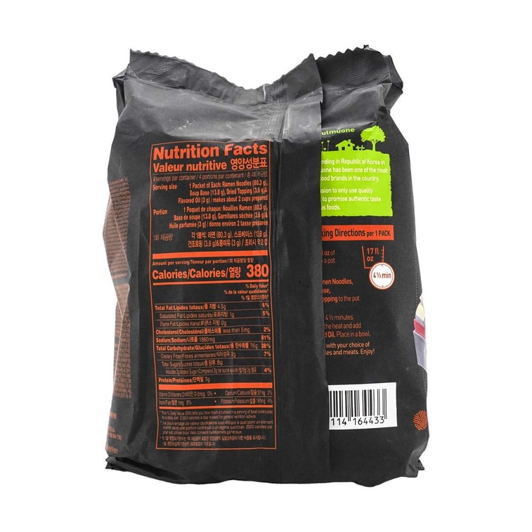 Soup Base: Sugar, Salt, Flavoring Base (Maltodextrin, Salt, Red Pepper, Onion Squid, Sugar, Green Onion, Seasoning Base (Maltodextrin, Sugar, Disodium Inosinate, Disodium Guanylate, Yeast Extract, Salt, Citric Acid), Rice Flour, Garlic, Mussel, Palm Oil, Red Pepper Powder, Fermented Soybean Concentrate (Soybeans, Water, Salt), Cod Bone Extract, Bean Sprouts Extract, Roasted Vegetable Extract (Roasted Vegetable Soup Base (Water, Shitake Mushroom, Onion, Green Onion, Garlic, Salt, Com Syrup, Salt, Shiitake Mushroom Extract Water (Shitake Mushroom, Corn Syrup, Maltodextrin, Salt), Water, Kelp Extract (Water, Ethyl Alcohol (To Protect Quality), Kelp, Maltodextrin, Salt, Hydrolyzed Soy Protein, Yeast Extract, Fermented Seasoning), Yeast Extract, Seasoning Base (Wheat Gluten, Maltodextrin, Yeast Extract, Dextrin, Soybeans, Salt, Water, Sugar), Disodium Guanylate, Disodium Inosinate, Mushroom Extract, Ginger, Disodium Guanylate, Guanylate, Disodium Inosinate, Paprika Oleoresin (For Color), Capsicum Oleoresin (For Flavor)), Crab Extract Powder (Red Snow Crab Extract (Red Snow Crab, Salt, Com Syrup, Sugar, Disodium Inosinate, Disodium Guanylate, Com Starch), Dextrin, Sand Crab, Salt), Flavor Base (Maltodextrin, Pacific Oyster, Salt, Cod Bone Extract, Soy Sauce Rice Flour, Sugar, Onion, Garlic, Disodium Inosinate, Disodium Guanylate, Yeast Extract, Citric Acid, Cayenne Pepper, Rice Bran Oil, Fermented Soybean Concentrate, Garuc Concentrate, Capsicum Oleoresin (For Flavor), Rosemary Oleoresin (For Flavor)), Squid Seasoning (Corn Syrup, Giant Calarmari, Squid, Water, Salt, Maltodextrin Dextrose, Soy Sauce, Enzyme,Yeast Extract, Disodium Inosinate, Disodium Guanylate), Flavor Base (Soy Sauce, Fermented Soybean Concentrate, Dextrose, Yeast Extract, Dark Brown Sugar, Salt, Dextrin), Dextrose, Salted Shrimp Powder (Salted Shrimp (Shrimp, Salt), Maltodextrin), Seasoning Mix (Wheat Gluten, Maltodextrin, Salt, Yeast Extract, Sugar, Soybeans, Water, Dextrin, Soy Sauce Seasoning (Soy Sauce, Salt, Onion, Yeast Extract, Dextrose, Maltodextrin), Soy Sauce Powder (Soy Sauce Palm Oil), Disodium Inosinate, Disodium Guanylate, Soup Seasoning (Maltodextrin, Salt, Sugar, Disodium hosinate, Disodium Guanylate, Yeast Extract, Citric Acid, Rice Flour, Green Onion, Soy Sauce (Defatted Soybeans, Water Palm Oil, Garlic, Soybeans, Water, Ginger, Black Pepper, Rosemary Oleoresin (For Flavor), Seafood Flavor Seasoning (Maltodextrin, Salt, Water, Littleneck Clam Extract Littleneck Clam Concentrate, Maltodextrin, Salt, Sugar, Corn Starch Cayenne Pepper Onion, Palm Oil, Garlic, Pollock Extract (Pollock, Maltodextrin, Salt, Xanthan Gum, Disodium Inosinate Disodium Glandate), Ginger, Soybeans, Giant Calamari, Disodium Guanylate, Disodium Inosinate, Yeast Extract, Com Syrup, Citric Acid, Dextrose, Soy Sauce, Enzyme), Wheat Protein, Shrimp Powder (Shrimp, Maltodextrin, Salt, Soybean Paste Powder (Soybean Paste Blend (Soybean Paste (Soybeans, Wheat Flour, Salt, Kojil, Salt, Ethyl Alcohol To Protect Quality), Water, Salt, Modified Tapioca Starch), Red Pepper Powder Vegetable Soup Mix (Maltodextrin, Garlic, Onion, Salt, Cabbage, Palm Oil, Water, Sugar, Corn Starch, Disodium Inosinate, Disodium Guanylate), Red Pepper Paste Powder (Red Pepper Paste Corn Syrup, Wheat Flour, Water, Seasoned Red Pepper, Salt, Red Pepper Powder, Wheat Flour Ma Wheat Rice), Ethyl Alcohol (To Protect Quality), Rice, Maltodextrin, Mixed Tocopherols (To Protect Quality), Palm Oil, Paprika Oleoresin (For Color), Black Pepper Powder, Mussel Powder, Capsicum Oleoresin (For Flavor). Dried Topping: Cabbage, Snow Red Crab Flavored Paste (Pollock Paste, Potato Starch Salt, Sugar, Soybean Protein, Paprika Oleoresin (For Color), Guar Gum, Snow Red Crab Tomato Color), Japanese Mustard Spinach Carrot
