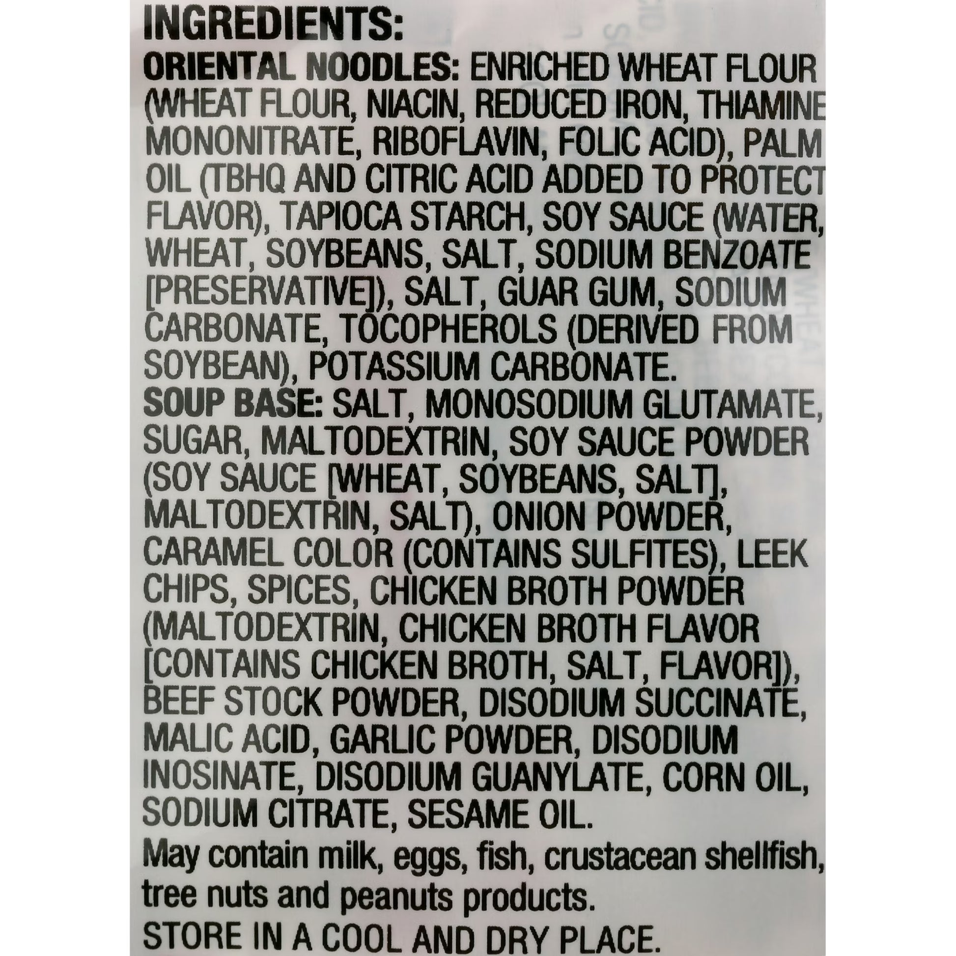 Oriental Noodles: Enriched Wheat Flour (Wheat Flour, Niacin, Reduced Iron, Thiamine Mononitrate, Riboflavin, Folic Acid), Palm Oil (Tbhq And Citric Acid Added To Protect Flavor), Salt, Sodium Carbonate, Sugar, Monosodium Glutamate, Tocopherols, Potassium Carbonate. Powdered Seasoning: Sugar, Salt, Caramel Color (Contains Sulfites), Monosodium Glutamate, Worcestershire Sauce Powder ([distilled Vinegar, Molasses, Corn Syrup, Salt, Caramel Color, Garlic Powder, Sugar, Spices, Tamarind, Natural Flavor And Sulfiting Agents], Maltodextrin, Silicon Dioxide), Vinegar Powder (Modified Corn Starch, Maltodextrin, Vinegar Solids), Maltodextrin, Soy Sauce Powder (Soy Sauce [water, Wheat, Soybeans, Salt], Maltodextrin, Salt), Sodium Diacetate, Citric Acid, Tomato Powder, Spices, Calcium Carbonate, Corn Oil, Corn Starch, Annatto (For Color), Disodium Inosinate, Disodium Guanylate, Disodium Succinate, Artificial Flavor. Dried Seaweed: Laver.