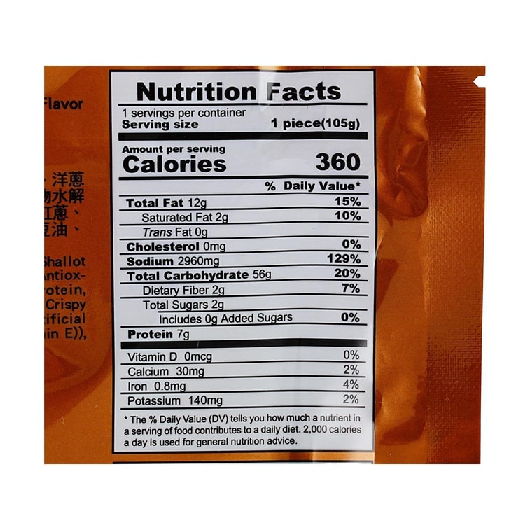 Sorbitol solution (70%), soybean oil, water, shallot-flavored oil [soybean oil, palm oil, onion powder, shallot powder, mixed tocopherol concentrate (antioxidant)], seasoning powder (salt, cane sugar, hydrolyzed vegetable protein, maltodextrin, yeast extract, cabbage powder, kelp powder), soy sauce, crispy shallots (shallot, palm oil, corn starch), glycerin, flavoring [flavoring, palm oil, sesame oil, soybean oil, lecithin, antioxidant (vitamin E)], garlic, mono- and diglycerides, chili.