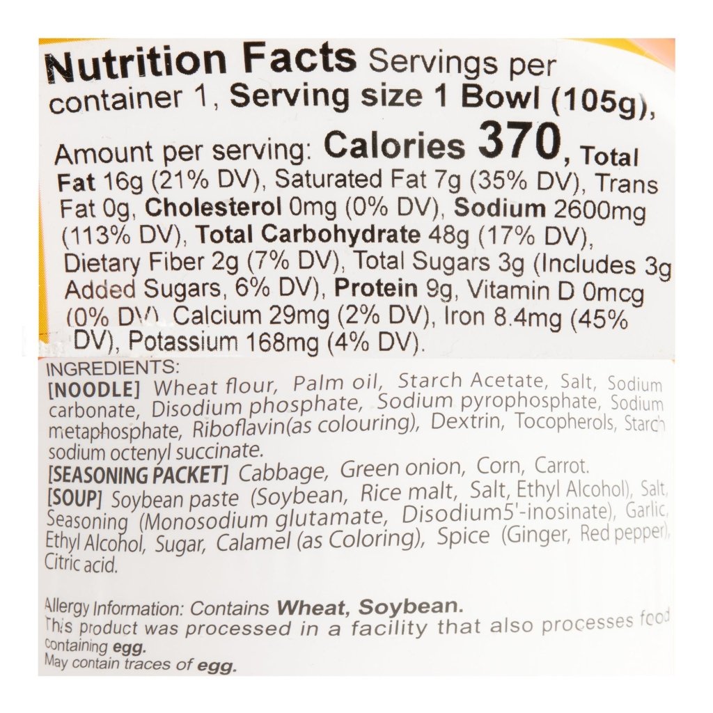 Noodles [Wheat Flour, Palm Oil, Starch Acetate, Salt, Sodium Carbonate, Disodium Phosphate, Sodium Pyrophosphate, Sodium Metaphosphate, Riboflavin (Coloring), Dextrin, Tocopherols, Starch Sodium Octenyl Succinate], Seasoning Packet [Cabbage, Green Onion, Corn, Carrot, Soup Base (Soybean Paste (Soybeans, Rice Malt, Salt), Ethyl Alcohol), Salt, Seasoning (Monosodium Glutamate, Disodium 5′-Inosinate), Garlic, Ethyl Alcohol, Sugar, Caramel (Coloring), Spices (Ginger, Red Pepper)], Citric Acid.