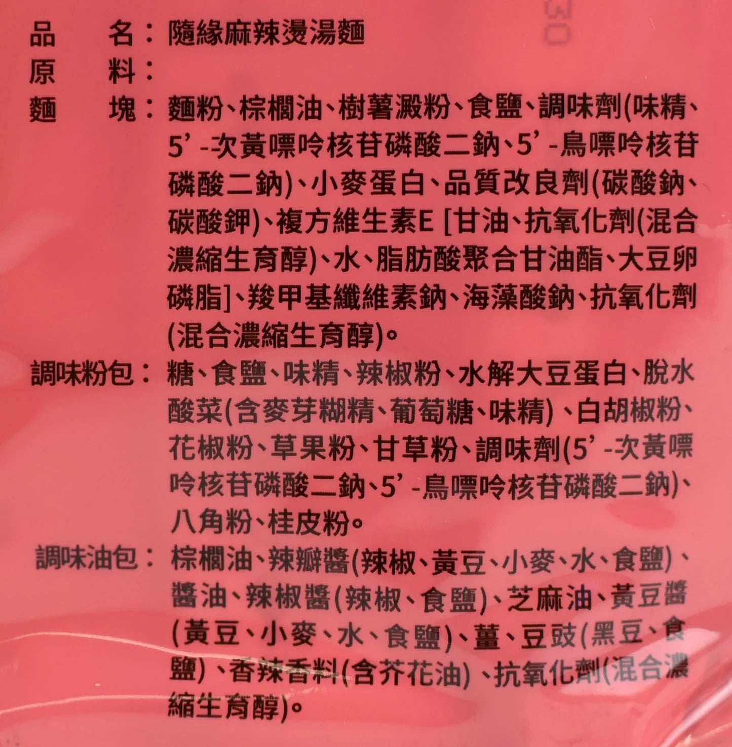 Wheat flour, palm oil, tapioca starch, salt, flavor enhancers (MSG, disodium inosinate, disodium guanylate), wheat protein, seasoning oil (chili, soy sauce, sesame oil, fermented black bean paste, garlic, ginger oil), pickled mustard greens, sugar, chili powder, white pepper, Sichuan pepper, cinnamon, star anise, hydrolyzed soy protein, antioxidants (mixed tocopherols).