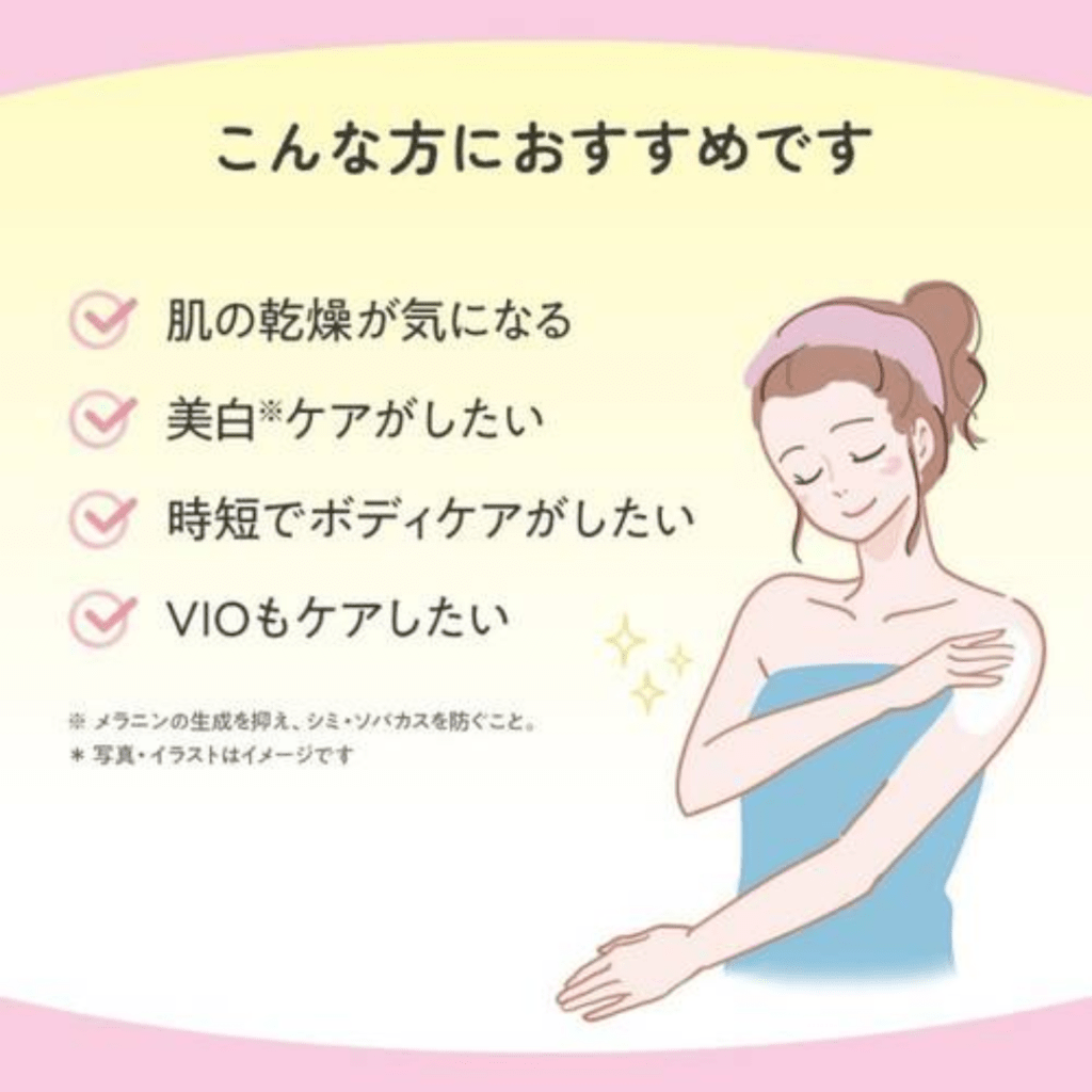 ■ A medicated body milk that whitens*1, prevents rough skin, and moisturizes in a short amount of time. ■ Quasi-drug active ingredients provide whitening*1 and rough skin prevention effects. Active medicinal ingredients: Placenta extract (1), stearyl glycyrrhetinate. ■ Formulated with carefully selected TBC ingredients. Skin conditioning ingredients: Gentian extract, fermented pear juice extract, artichoke extract. Moisturizing ingredients: Fucoidan*2, soybean extract, hydrangea extract, gynostemma pentaphyllum extract, collagen tripeptide F, sodium hyaluronate (2). ■ Features a unique hook-shaped container that can be hung on a towel rack in the bathroom. It takes up little space and keeps your bathroom tidy! ■ Mildly acidic formula recommended for both the body and VIO area ■ Paraben-free, alcohol-free, colorant-free, mineral oil-free, silicone-free, and petroleum-based surfactant-free ■ [Quasi-drug] ■ Country of Origin: Japan *1 Suppresses melanin production and prevents dark spots and freckles. *2 Seaweed extract (1) ◇ Apply to wet skin after bathing, before towel drying. (If skin is very wet, drain thoroughly before use.) ◇ Dispense an appropriate amount (about the size of five cherries) into the palm of your hand and massage into skin. After application, gently pat with a towel to remove excess moisture. ◇ After use, securely close the cap. ◇ Can be used on dry skin. ◇ For a more moisturizing feel, dry with a towel before use. ◇ The container can be hung from a towel rack or similar. -Please note that skin is slippery after application- ◇Please be careful as it is especially slippery when applied to the heels and soles of the feet. ◇As arms and hands are slippery immediately after application, do not pick up your child until you have dried them with a towel. ◇If it gets on the bathroom floor, rinse thoroughly.