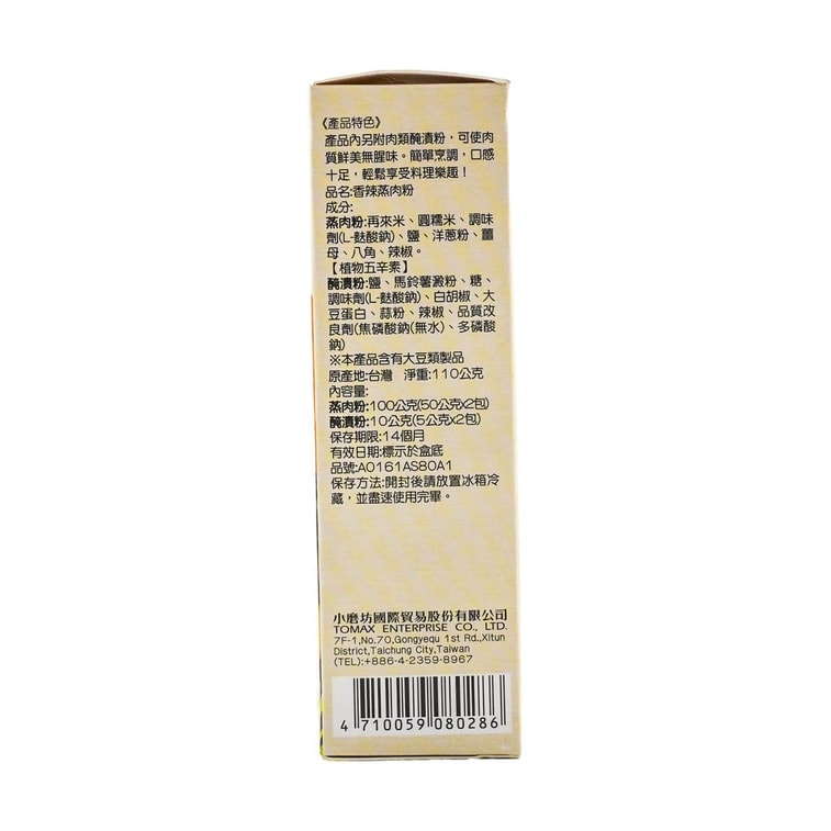 Tomax’s Chili Steamed Meat Powder is a ready-mix seasoning designed for traditional Chinese-style steamed dishes. Featuring ground rice, chili, and aromatic spices, it adds a mildly spicy, savory coating to pork or ribs—just mix, marinate, and steam. Each pack brings the comforting depth of Taiwanese home-style cooking with minimal prep.