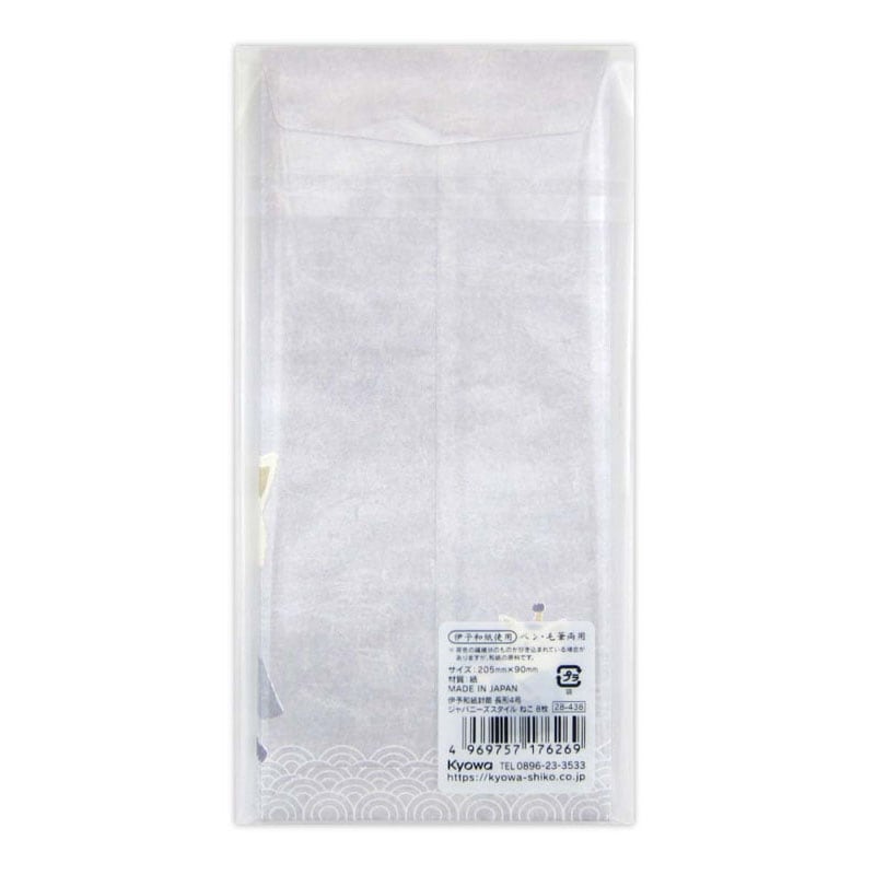 These No. 4 long envelopes are crafted from textured Iyo washi paper and feature a design combining Japanese motifs like samurai, ninja, and Daruma with cats. Suitable for both pen and brush writing.