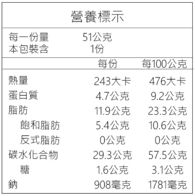 Wheat flour, palm oil, tapioca starch, acetylated starch, salt, wheat gluten, quality improvers (sodium carbonate, potassium carbonate), mixed vitamin E preparation [glycerol, antioxidant (mixed tocopherols concentrate), water, polyglycerol esters of fatty acids, soy lecithin], sodium carboxymethyl cellulose, gardenia yellow pigment (maltodextrin, gardenia yellow pigment), sodium alginate, antioxidant (mixed tocopherols concentrate).