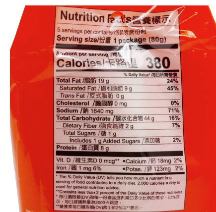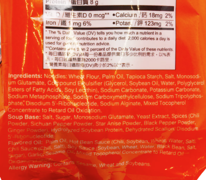 MSG, salt, sugar, beef powder (with maltodextrin, salt, sugar), potato starch, dehydrated bok choy (with glucose), hydrolyzed soy protein, dehydrated scallion, chili powder, Sichuan pepper, star anise, black pepper, ginger powder, disodium succinate, disodium inosinate, disodium guanylate.
