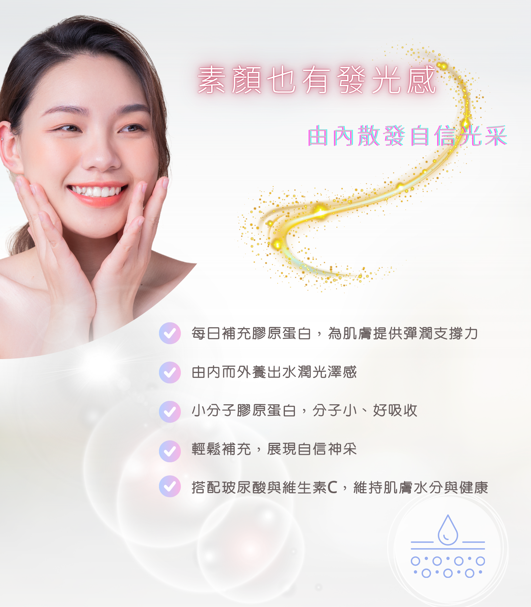 結合膠原蛋白胜肽、玻尿酸、維生素C(西印度櫻桃)、與神經醯胺(日本米胚芽萃取),由內而外補充肌膚所需營養,維持水潤與彈性,打造每日自信光采。 無人工色素、無防腐劑,輕鬆融入日常保養。